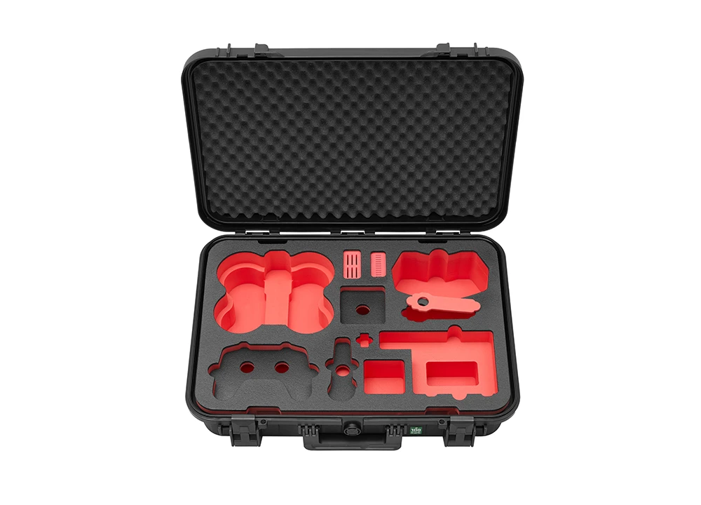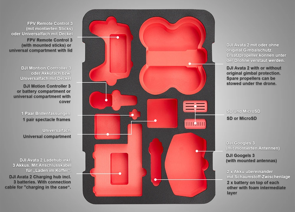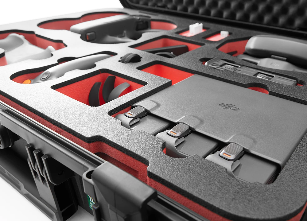 Mit passgenauem Inlay aus hochwertigem PE-Hartschaumstoff mit Aussparungen für Drohne, Controller, Brille, Lademanagement mit „Akkus aufladen im Koffer“ -Funktion und viel Zubehör. Der integrierte Noppenschaumstoff im Deckel schützt dabei das Drohnenequipment zusätzlich.