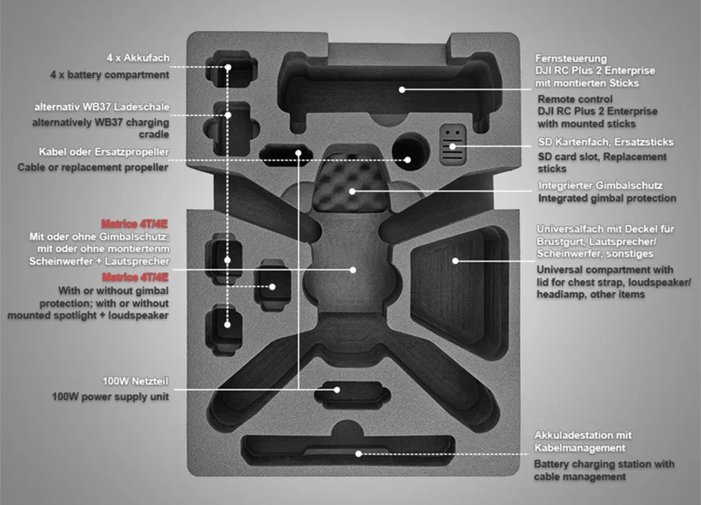 Der TOMcase „Ready to Fly“ Koffer wurde speziell für den professionellen Einsatz mit der DJI Matrice 4 Serie entwickelt. Die Drohne kann flugbereit mit montierten Propellern, Lautsprecher, Scheinwerfer (optional) und ohne Gimbalschutz verstaut werden – für den sofortigen Einsatz vor Ort. Ein integrierter Weichschaum schützt das Gimbal zuverlässig vor Erschütterungen und Beschädigungen, auch wenn der Koffer auf dem Rücken liegt.