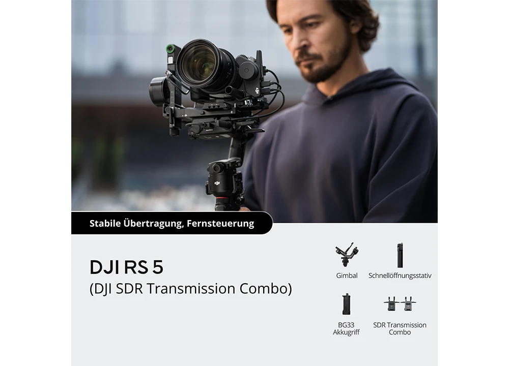 Der DJI RS 5 ist ein kompakter, leistungsstarker 3-Achsen-Stabilisator für professionelle Content Creator. Mit intuitivem Touchscreen-Tracking, Feineinstellrädern, verlängerter Akkulaufzeit und direkter Steuerung über den neuen elektronischen Aktentaschengriff eignet er sich für unterschiedlichste Drehsituationen. Die native Hochformataufnahme, der optimierte Stabilisierungsalgorithmus der 5. Generation sowie eine Tragkraft von bis zu 3 kg machen den RS 5 zur idealen Wahl für spiegellose Kamera-Setups.